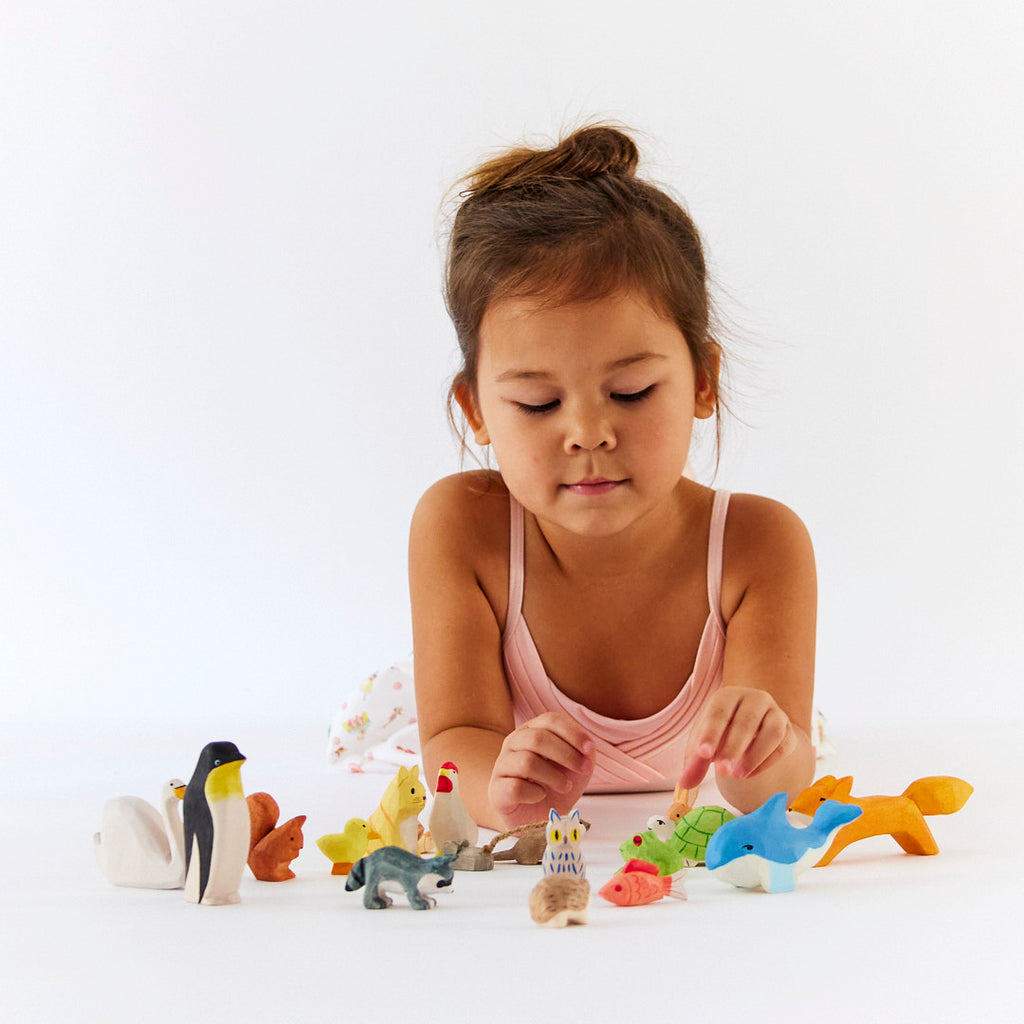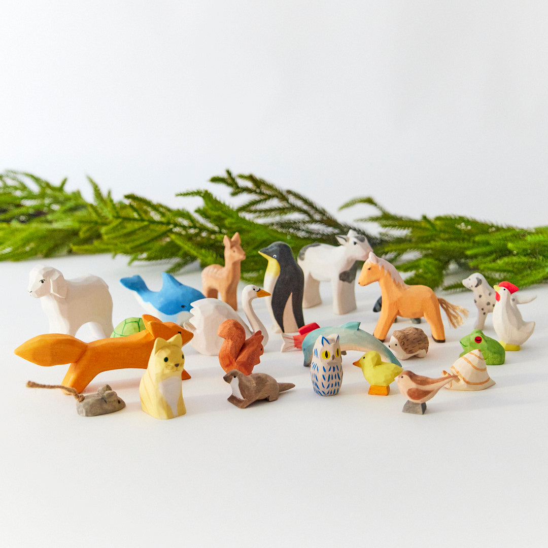 Wooden Deer, Dolphin, Snowy Owl, Mouse, Cow, Dog, Fish, Fox, Raccoon, Cat, Turtle, Sheep, Snail, Otter, Hedgehog, Squirrel, Bunny, Whale, Penguin, Swan, Horse, Frog, Rooster, Duck, and Chickadee.