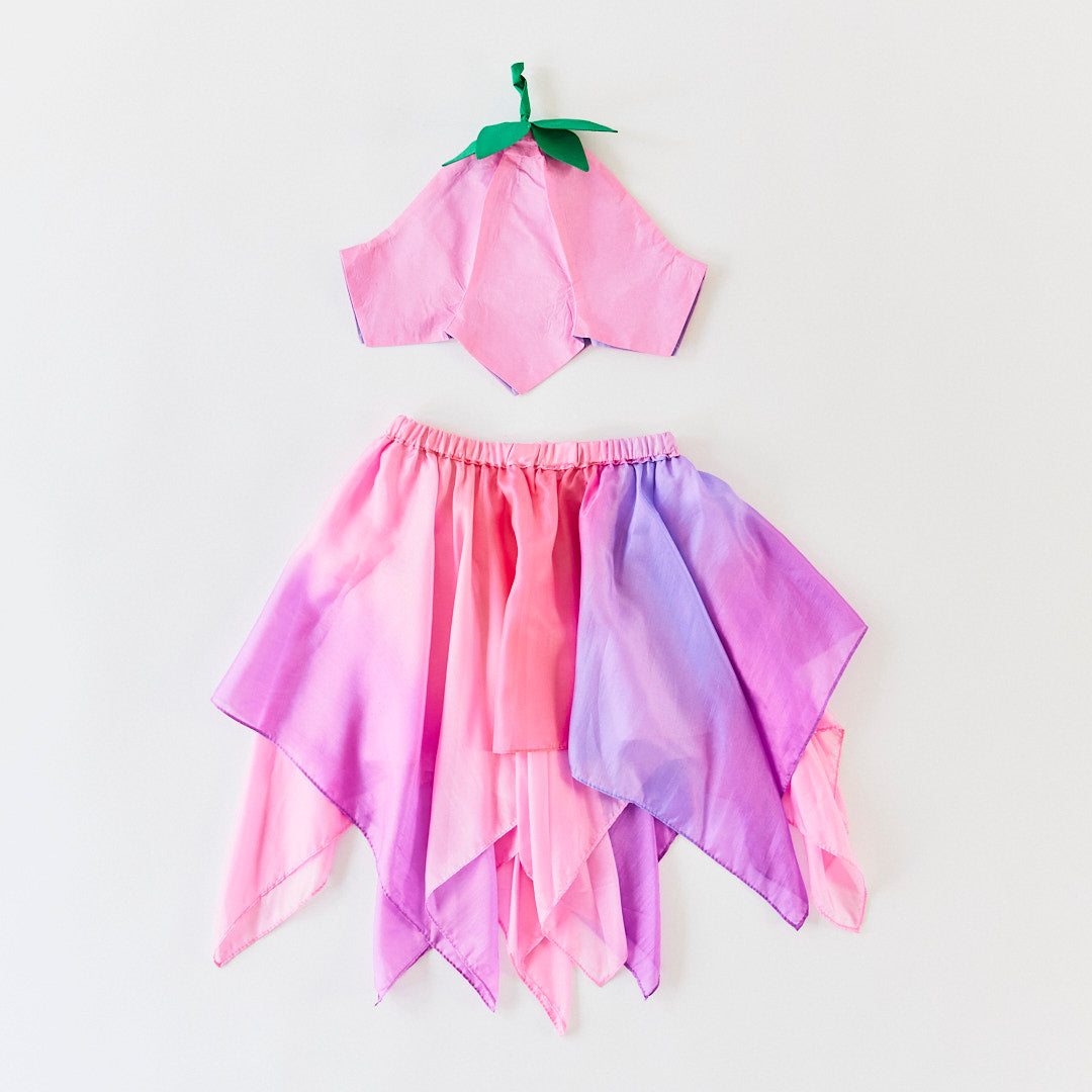 The Cherry Blossom Fairy Set captures the feeling of early spring in bloom. With flowing silk and soft petal shapes, it invites children to step into imagined gardens and wander beneath blossoming trees. The skirt moves lightly with play, while the blossom hat adds a gentle floral touch.